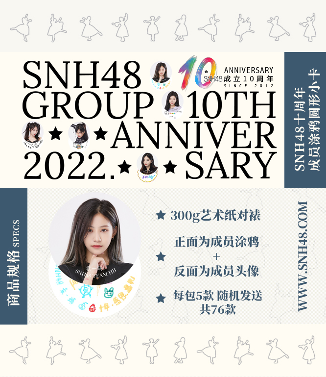 SNH48十周年成员涂鸦版圆形小卡惊喜上架!共76款,正面为成员十周年主题涂鸦、背面为成员私服主题头像。成员亲笔绘制的十周年主题涂鸦及成员自主穿搭的私服主题头像,充满了成员的想法与创意。一套内含5款圆形小卡,随机发货。喜欢的粉丝朋友千万不要错过啦~