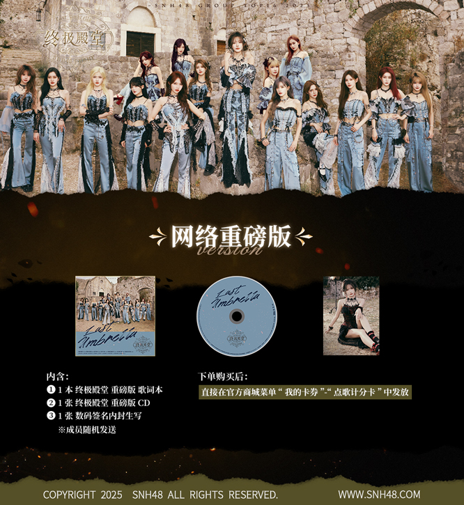 网络重磅版所附赠的2025 SNH48 GROUP第十二届年金曲大赏专属点歌计分卡 1张(每张点歌计分卡最高可为作品计 32分),直接在菜单 “我的卡券” - “点歌计分卡” 中发放。